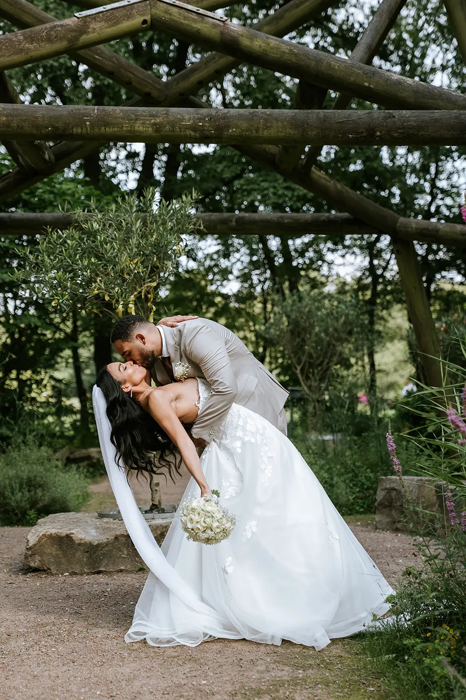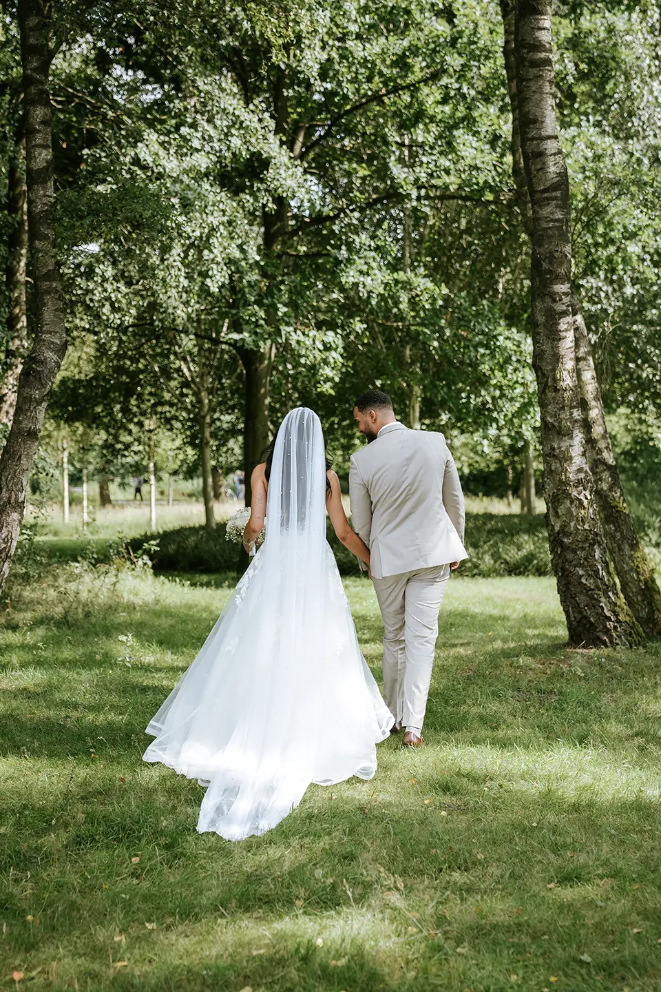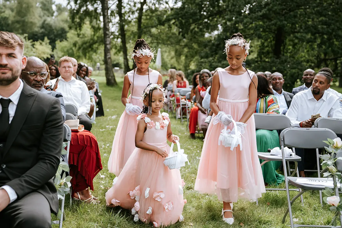 Die Zeremonie war im Boho-Stil gehalten – eine freie Trauung auf einer grünen Wiese, ohne unnötige Details, dafür mit echten Gefühlen und lebendigen Momenten. Der Stadtpark Norderstedt bot die perfekte Kulisse: sanftes Sonnenlicht, sattes Grün, kleine Waldwege und weite Rasenflächen. Die Natur selbst sorgte für einen stimmungsvollen Rahmen – und so entstanden künstlerische Hochzeitsfotos und Videos, die noch lange an diesen Tag erinnern werden.