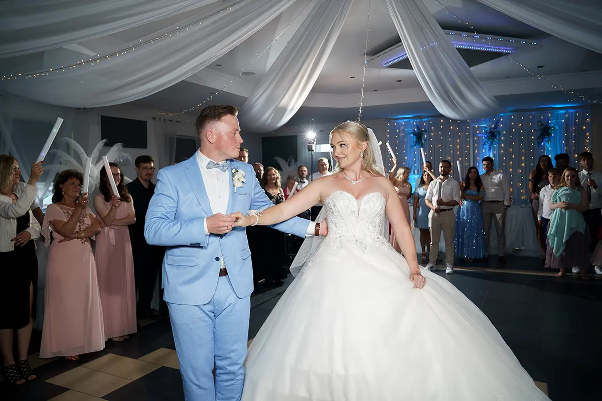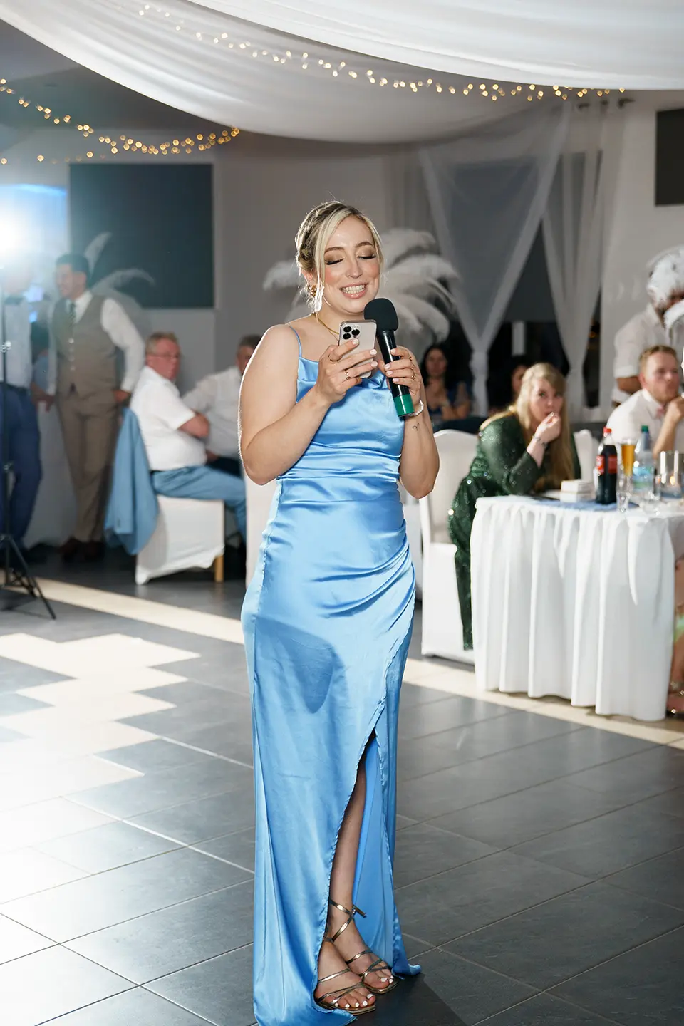 Nach der Trauung ging es weiter nach Lindern. Wir waren β wie immer β etwas frΓΌher vor Ort, um den spektakulΓ€ren Empfang von Valeria und Frank vorzubereiten: ein unvergesslicher Moment, als sie voller Energie und Freude in den festlich geschmΓΌckten Saal einzogen.